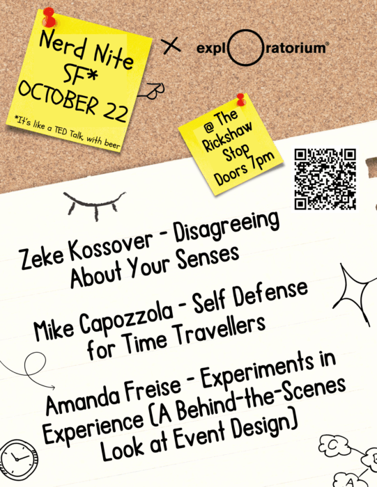 The spooky season is finally here! Dust off your cobwebs, set up your 12ft tall yard skeletons, and mark your calendars for the Nerd Nite SF 2025 season finale! It’s our last show of the year and we’ve got talks to cover spooky situations like falling into a time vortex (how do you defend yourself if you wind up in another era?), questioning whether your senses are lying to you (sure, let’s add more existential terror to our lives), and how to survive the most terrifying thing of all: Public Speaking.